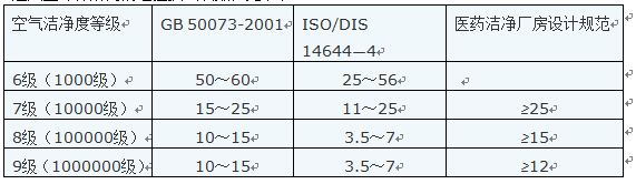然而,在实际工程中,通风率k很难由上述公司计算,一般采用经验通风率。在中国,《洁净厂房设计规范》 (GB 50073-2001)明确规定了计算不同等级的非单向流洁净室洁净空气供给量所需的经验通风次数,如下表所示: